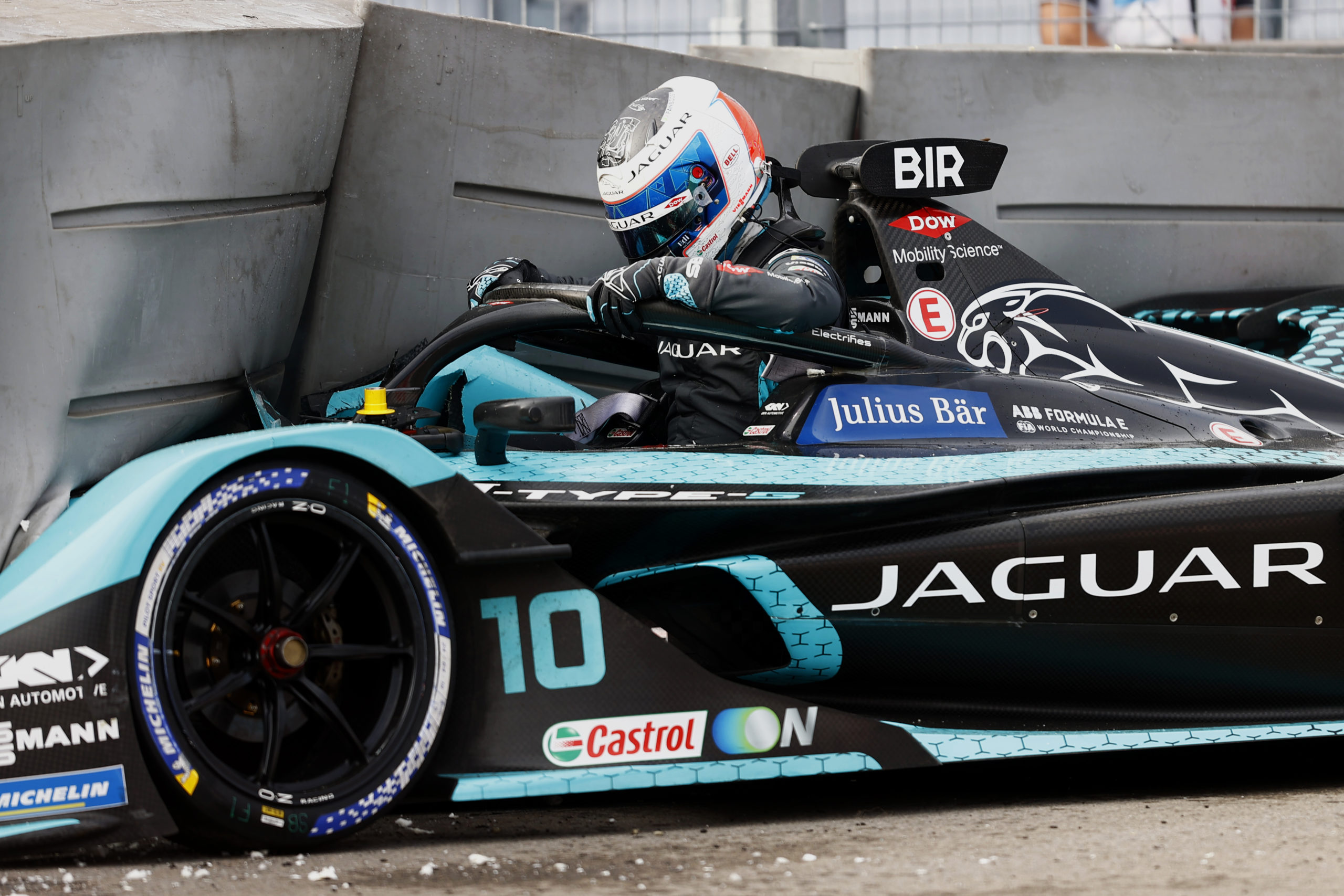Sam Bird (GBR), Jaguar Racing, climbs out of his cockpit after crashing out in FP1