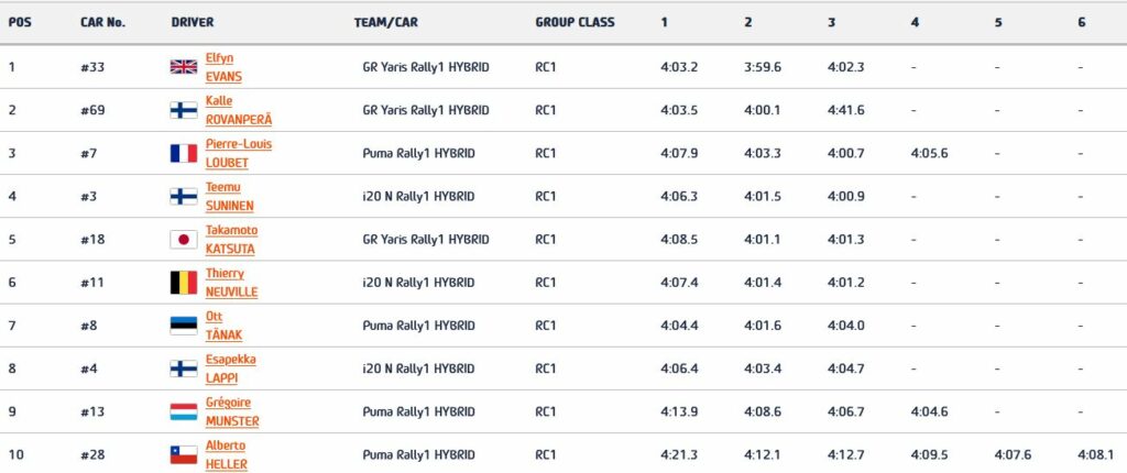 Ott Tänak could only muster the seventh-best time in his Puma ahead of Esapekka Lappi. Grégoire Munster and Alberto Heller, both making their debut in Rally1 machinery completed the top 10.
