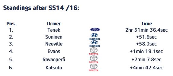 Tanak is cruising to the finish, saving his car and tyres for the Wolf Power Stage later this afternoon where extra championship points are on offer. While overall positions in the top six remain unchanged, Suninen has seen his lead cut from 13.9 seconds overnight to just 6.7 seconds by his teammate Thierry Neuville in a frenetic fight for second.