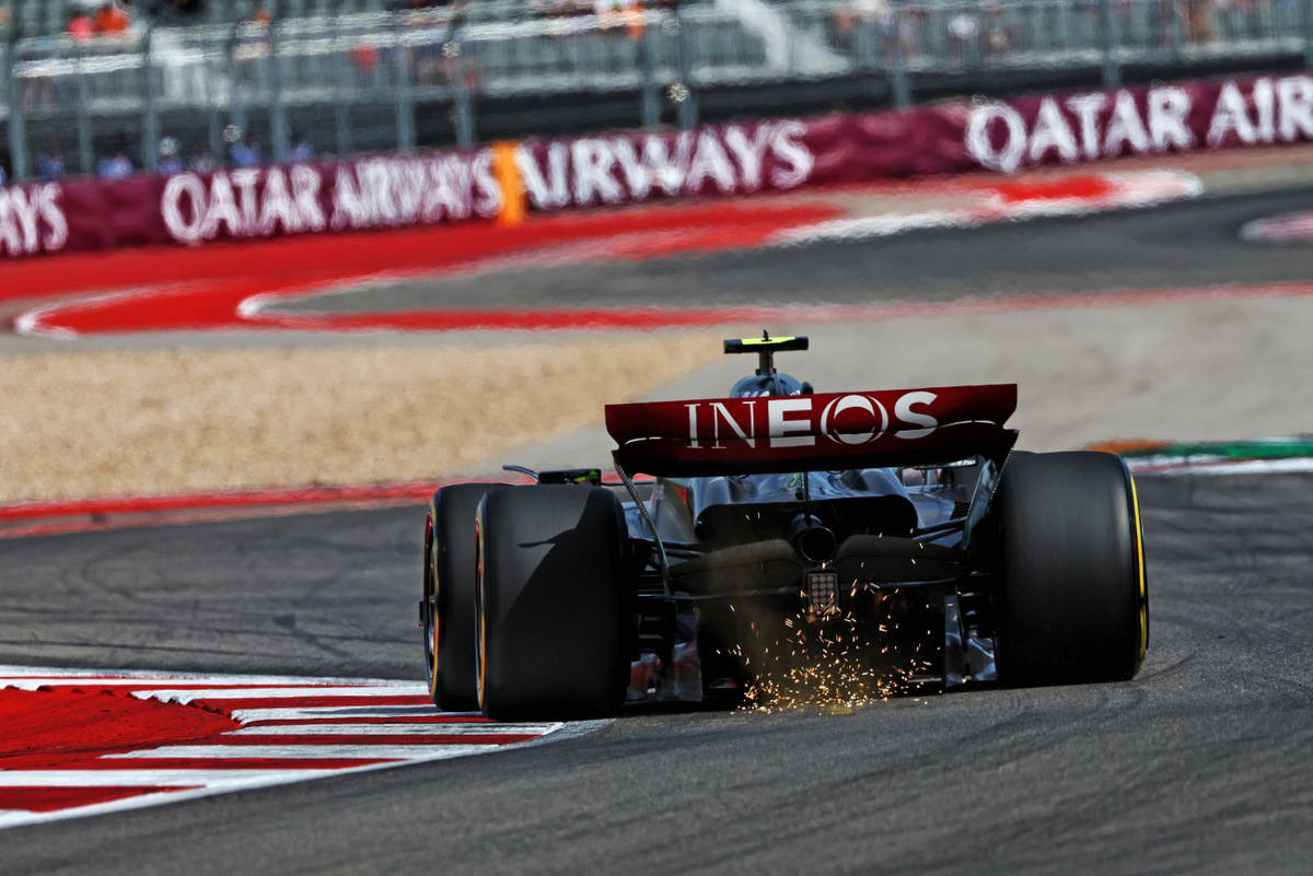 Lewis Hamilton (GBR) Mercedes AMG F1 W14 sends sparks flying. 21.10.2023. Formula 1 World Championship, Rd 19, United States Grand Prix, Austin, Texas, USA, Sprint Day. - www.xpbimages.com, EMail: [email protected] © Copyright: Coates / XPB Images
